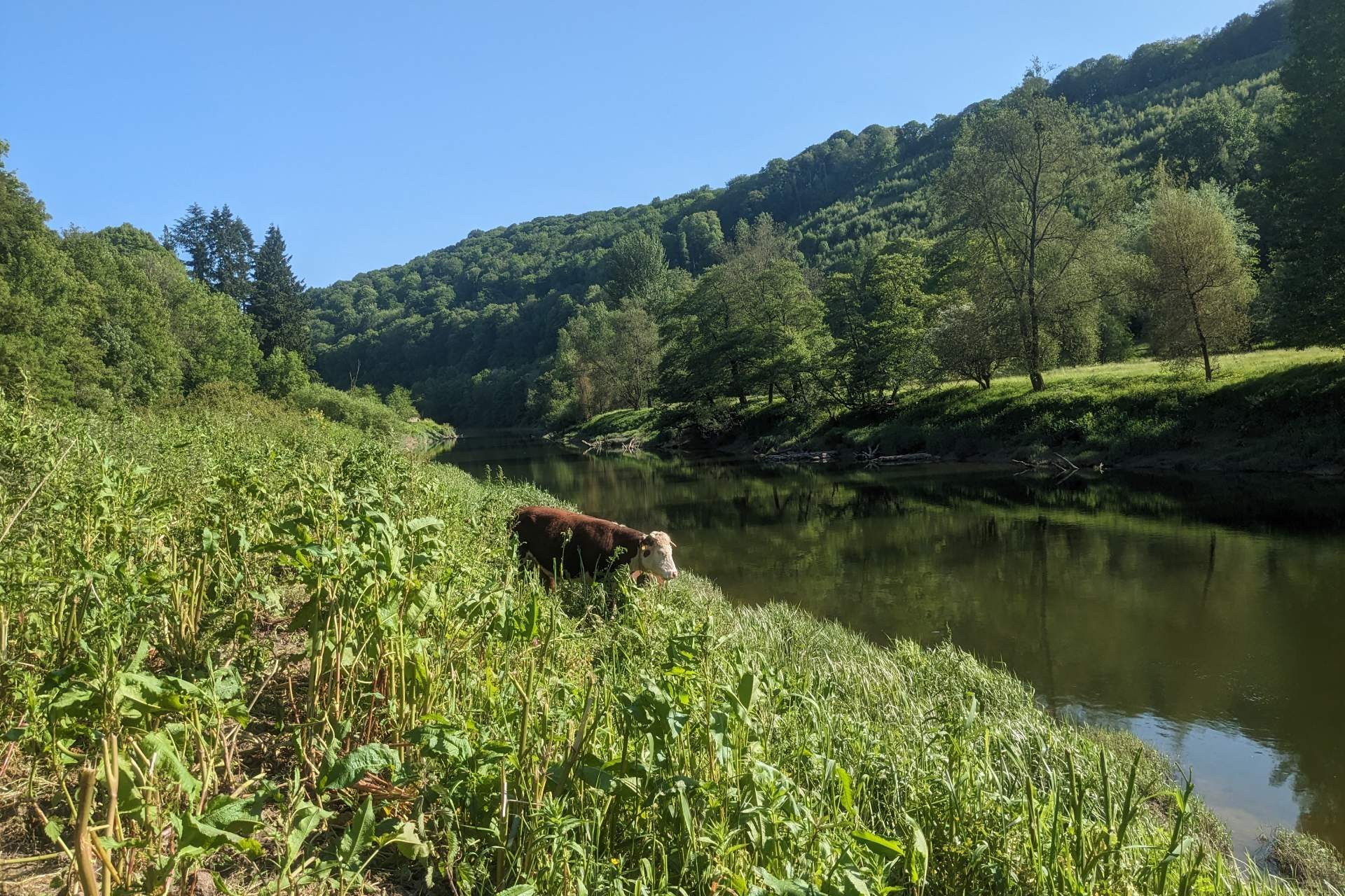 Working alongside the Wye Valley AONB team and a private landowner, we’re grazing a stretch of riverbank which has become overgrown with invasive Himalayan Balsam. Due to the tidal nature of the river in the section, and the difficult access for machinery, this has been a challenging site for volunteers or contractors to manage. Our cattle are happily munching their way through the section, keeping down the bracken while they’re at it.